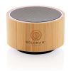 Altavoz 3W de bambú natural con batería interna de 300mAh. Reproducirá música hasta 3h con una sola carga y su distancia operacional es de hasta 10 metros BT4.1. Incorpora una luz ambiental.