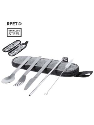 Set Cubiertos TailungSet de cubiertos reutilizables fabricados en resistente y duradero acero inox. Incluye cuchara, cuchillo, tenedor, pajita y accesorio de limpieza. Presentados en elegante estuche individual de poliéster 300D RPET, elaborado a partir de plástico reciclado para así fomentar la reutilización de residuos plásticos y ayudar a la sostenibilidad del planeta. Estuche con cinta de transporte, cierre de cremallera y distintivo RPET en etiqueta.Desde 3,58 € /ud