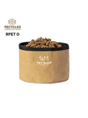 Bowl plegable para mascotas de 1,3l de capacidad, con exterior en resistente papel reciclado laminado de 270g/m2. Interior en poliéster RPET, elaborado a partir de plástico reciclado, para así fomentar la reutilización de residuos plásticos y ayudar a la sostenibilidad del planeta. Apto para sólidos y líquidos.