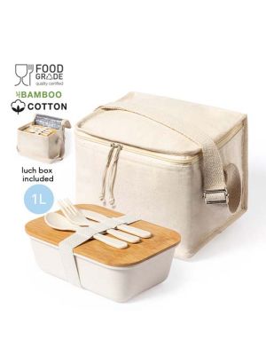 Set de fiambrera y nevera de línea nature con Certificación Food Grade, garantizando la seguridad cuando los alimentos entran en contacto con el material usado para fabricar el producto. Incluye:Nevera fabricada en material 100% algodón, con interior isotermo acabado en aluminio. Cierre de cremallera con doble tirador de cordón y asa de transporte a juego.Fiambrera fabricada en PP veteado libre de BPA, con tapa de bambú y 1l de capacidad. Cierre de cinta elástica de seguridad, con compartimentos para tenedor, cuchara y cuchillo (incluidos).