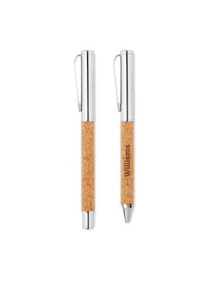 QUERCUS Set bolígrafo y roller corchoSet de bolígrafo giratorio y roller de metal (tapón) con cuerpo de corcho. Presentado en caja de corcho a juego. Tinta azul y negra respectivamente.Desde 6,85 € /ud