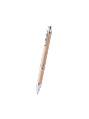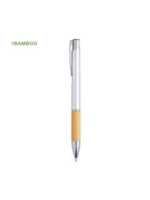 Bolígrafo de línea nature con cuerpo en madera de bambú. De mecanismo pulsador, con clip troquelado y detalles en acabado cromado. De cartucho jumbo y tinta negra.