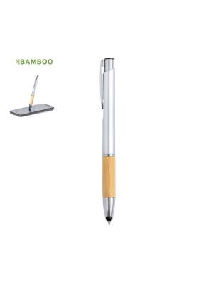 Bolígrafo puntero de línea nature y mecanismo pulsador. De elegante diseño, con cuerpo en aluminio de acabado mate y empuñadura en bambú, con accesorios en acabado mate. Clip metálico y anilla transparente, en tinta azul. Disponible en variada gama de colores.