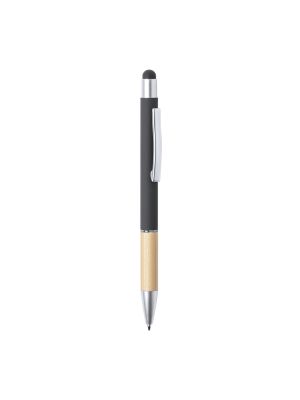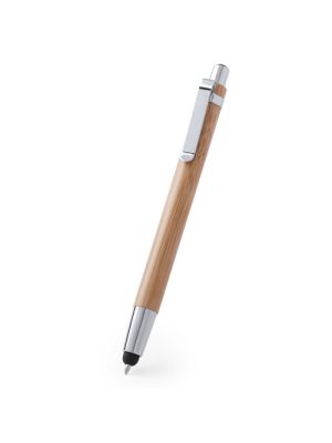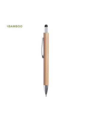 Elegante bolígrafo puntero de línea nature y mecanismo pulsador. Cuerpo en resistente ABS de acabado brillo y empuñadura en bambú, con accesorios a juego. Clip metálico, con cartucho jumbo y en tinta azul.
