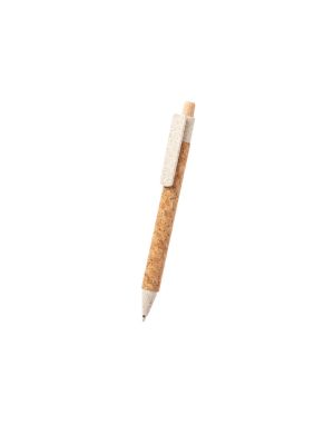 Bolígrafo de línea nature con cuerpo en corcho natural. Clip, punta y pulsador en caña de trigo, para así fomentar la utilización de materias primas naturales y reducir las emisiones de contaminantes. Con clip especialmente diseñado para marcaje en tampografía. De mecanismo pulsador y con tinta azul.