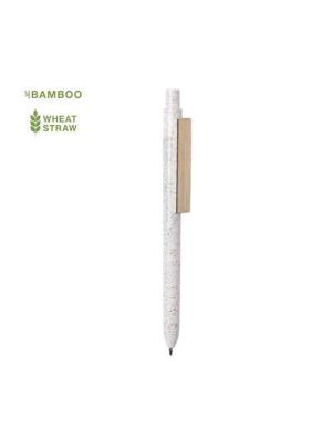 Bolígrafo de línea nature y mecanismo pulsador. Cuerpo fabricado en combinación de caña de trigo y clip en bambú, para así fomentar la utilización de materias primas naturales y reducir las emisiones contaminantes. Clip con amplia zona de marcaje y en tinta azul. Distintivo caña de trigo en la parte superior del bolígrafo.