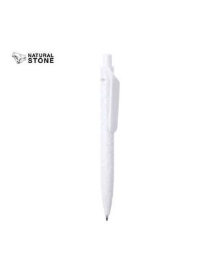 Bolígrafo de línea nature y mecanismo pulsador. Cuerpo troquelado fabricado con extractos de piedra natural, ayudando a la reducción del uso de plásticos, además de proporcionar un acabado suave y resistente. En color blanco y con distintivo natural stone en la parte superior, de cartucho jumbo y en tinta azul.