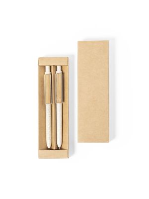 Set BruneokSet de bolígrafo y portaminas de línea nature. Fabricado en combinación de caña de trigo con clip en bambú, para así fomentar la utilización de materias primas naturales y reducir las emisiones contaminantes. Clip con amplia zona de marcaje. Bolígrafo en tinta azul y portaminas con 2 minas incluidas de 0,5mm. Presentado en estuche individual de cartón reciclado.Distintivo Wheat Straw en la parte superior del bolígrafo y portaminas.Desde 0,74 € /ud