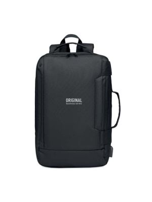 HANA Mochila para portátil 600D RPETMochila para portátil de 15'' en poliéster RPET 600D. 3 grandes compartimentos exteriores con cremallera totalmente acolchados con varios bolsillos interiores. Dispone de dos bolsillos laterales de malla. Tirantes ajustables. Parte trasera de malla acolchada con flujo de aire. Soporte para trolley en la parte trasera.