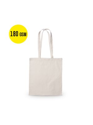 Bolsa en resistente material 100% algodón de 180g/m2 con acabado en color natural. Con asas largas de 70cm y acabado cosido. Resistencia hasta 9kg de peso.