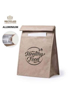 Bolsa térmica en papel resistente a la humedad de 85g/m2. Con interior isotermo acabado en aluminio, bolsillo exterior y cierre de velcro. 2,3 litros de capacidad.