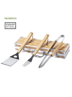Set Barbacoa LenvitSet de barbacoa de línea nature y 3 accesorios fabricados en metal con mango de bambú. Incluye paleta con abridor, trinchador y pinzas. Presentado en estuche imitación bambú, con terminaciones en metal. Presentado en atractiva caja individual de diseño eco.