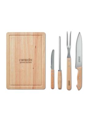 Set de 4 accesorios de barbacoa de acero inoxidable con tabla de cortar de madera, presentado en estuche de poliéster. Incluye cuchillos, tenedor y afilador. El bambú es un material natural, el color del articulo puede variar.