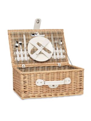 Cesta de picnic de mimbre para 2 personas con 1 abrebotellas, 2 cucharas de acero inoxidable, tenedores y cuchillos, 2 platos de cerámica, 2 vasos de cristal y 2 servilletas de polialgodón.