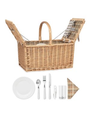 Cesta de picnic de mimbre para 4 personas con 1 abrebotellas, 4 cucharas de acero inoxidable, tenedores y cuchillos, 4 platos de cerámica, 4 vasos de cristal y 4 servilletas de polialgodón.