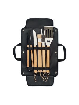 Juego de utensilios para barbacoa de 5 piezas de acero inoxidable con mango de bambú y bolsa de canvas encerado. Incluye espátula, cuchillo, pinzas, tenedor y cepillo para hornear.