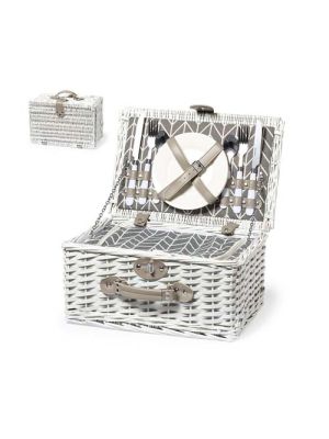 Lleva el estilo a tus picnics con este set tan cool. Cesta nevera para picnic con acabado color blanco, con asas y cintas de ajuste en color gris. Ideal para dos personas gracias a sus dos completos servicios y multitud de accesorios. Incluye original nevera con interior isotermo de aluminio.