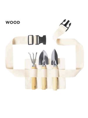 Set Jardinería MaurixSet de jardinería de 3 accesorios, fabricado en metal con mango de madera. Incluye pala grande, pala pequeña y rastrillo. Con riñonera de transporte en algodón y cierre de click ajustable. presentado en atractiva caja de diseño eco.