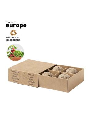 Kit Huerto TomaruxKit huerto con semillas de tomate, albahaca, rúcula y manzanilla. Presentado en estuche de cartón reciclado con instruciones de plantado, distintivo Made in Europe y con 4 compartimentos independientes.