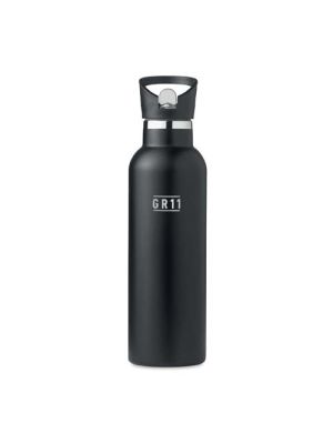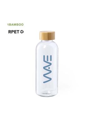 Botella en RPET con acabado de goma y acero inoxidable con tapa interior RPET y anillo de silicona. Sin BPA. Sin fugas. Capacidad: 600 ml. No apto para bebidas gaseosasAnti fugas.