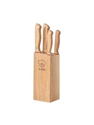 Juego de cuchillos de madera. Incluye soporte de base y 5 cuchillos: para Chef, de pan, rebanador, multifuncional y pelador. Acero inoxidable con mango de madera.