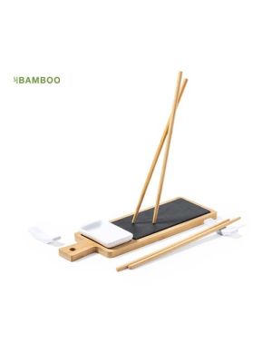 Set de sushi premium de 6 piezas, fabricado en bambú y pizarra natural, e ideal para servicio o presentación. Incluye tabla de presentación de bambú en combinación con pizarra natural , 2 juegos de palillos en bambú natural con soportes de cerámica y un cuenco de cerámica. Presentado en caja individual de diseño eco en cartón kraft.