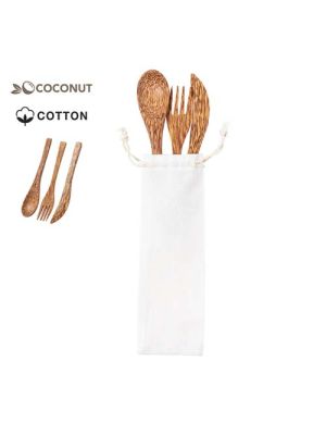 Set de cubiertos reutilizables de línea nature fabricados en coco. Tras el consumo de su fruto, del coco y su planta se pueden obtener multitud de productos, contribuyendo a la sostenibilidad del planeta y fomentando el uso de materias primas naturales. Incluye cuchara, cuchillo y tenedor. Presentados en bolsita individual de algodón con cierre de cordón.