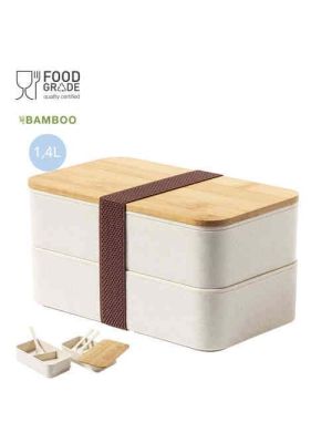 Fiambrera de 1,4l en resistente material PP veteado libre de BPA, con tapa de bambú. Dos compartimentos, cada uno de 700 ml de capacidad. Compartimento interior con tenedor, cuchara y cuchillo. Incluye cinta de seguridad exterior. Certificación Food Grade, garantizando la seguridad cuando los alimentos entran en contacto con el material usado para fabricar el producto.