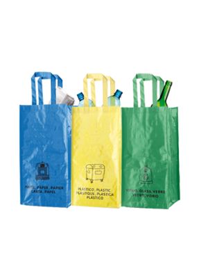 Set de 3 bolsas de reciclaje amarilla-verde-azul en resistente pp-woven laminado de 125g/m2 de acabado brillante. Incluye 3 bolsas de 23x45x23cm unidas entre sí mediante resistentes velcros laterales. Con asas reforzadas e indicación de tipos de residuo: plástico y envases, vidrio y papel.