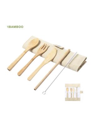 Set de cubiertos de línea nature fabricados en bambú pulido. Incluye tenedor, cuchara, cuchillo y pajita con cepillo limpiador. Presentados en funda plegable de canvas, con elástico interior para una firme sujeción de las piezas y cierre de seguridad con corchete.