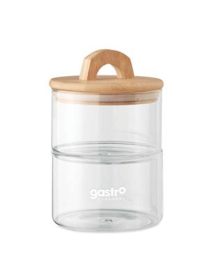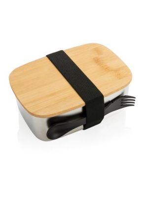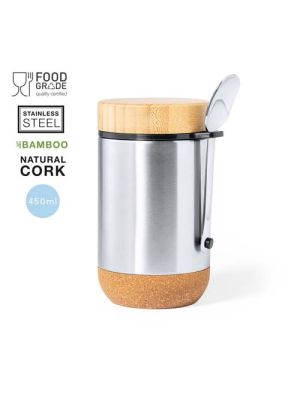 Fiambrera de línea nature y 450 ml de capacidad. Cuerpo en acero inox, con base de corcho para mantener la temperatura y tapón de seguridad en bambú, con accesorio de fijación para la cuchara de acero inox (incluida). Presentada en caja individual de diseño eco en cartón kraft.