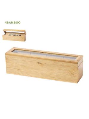 Caja para té de línea nature, fabricada en bambú, con cristal en tapa. Incluye 4 compartimentos para almacenar distintos tipos de té. Presentada en atractiva caja de diseño eco.