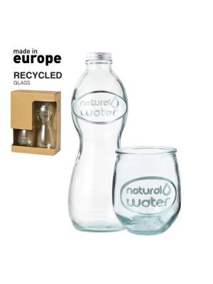 Set de de línea nature de 2 vasos de 400 ml y una botella de 1l. De fabricación europea y hechos en vidrio reciclado GRS. Botella con tapón a rosca metálico. Set presentado en estuche de cartón reciclado con ventana. La certificación GRS (Global Recycled Standard / Estándar de Reciclaje Global), garantiza el origen reciclado del material usado para fabricar el producto.