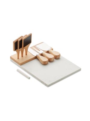 Tabla de mármol para servir quesos con 3 cuchillos de bambú y acero inoxidable para quesos y 3 marcadores de aperitivos .incluye 1 tiza. Presentado en caja de regalo.