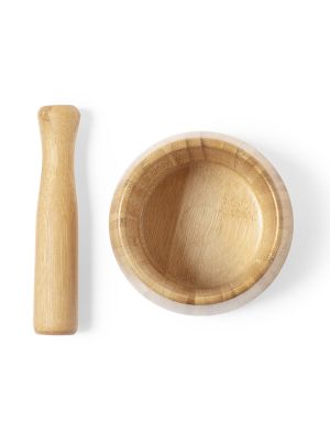 Mortero de línea nature. Fabricado en bambú, para así fomentar el uso de materias primas naturales. Con macerador incluido y presentado en caja individual de diseño eco.