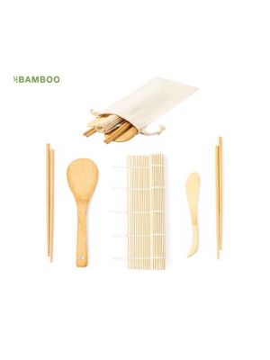 Set de sushi de 5 piezas fabricado en bambú natural. Compuesto por una estera de sushi, 2 juegos de palillos, una cuchara y cuchillo/paleta para el arroz. Incluye bolsa de algodón para fácil transporte y almacenaje. Presentado en caja individual de diseño eco en cartón kraft.