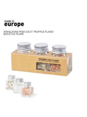 Set de 3 tarros de sales gourmet, sal rosa del Himalaya, escamas de sal de trufa y escamas de sal boletus. De fabricación europea, hechos en cristal con tapón a rosca metálico. Set presentado en estuche de cartón con ventana.