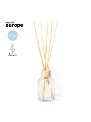Difusor aromático de suave aroma jazmín blanco de larga duración, con 5 varillas de ratán. En bote de 50 ml fabricado en cristal y con distintivo Made In Europe. Presentado en atractiva caja de diseño eco y acabado kraft.