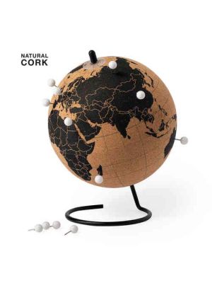 Globo terráqueo de línea nature para los más viajeros. Fabricado en corcho natural, con base metálica y 12 marcadores chincheta incluidos. Presentado en atractiva caja de diseño eco.