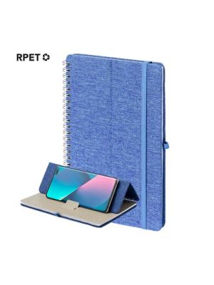 Libreta soporte de anillas de línea nature. Tapas rígidas fabricadas en resistente material RPET 300D, elaborado a partir de plástico reciclado. Con original soporte para smartphone y tablet integrado en la portada y fabricado en caña de trigo. Incluye elástico de cierre y soporte para bolígrafo a juego. 70 hojas interiores con disposición a una raya y disponible en variada gama de colores. Con distintivo RPET en contraportada y presentada en bolsa individual reciclada.