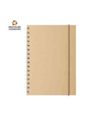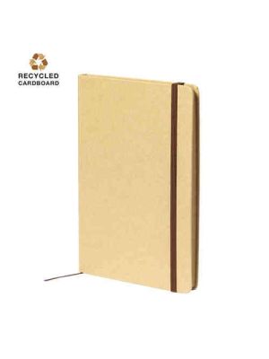 Bloc de notas A5 de línea nature, con tapas duras en resistente cartón reciclado. De 100 hojas lisas en acabado kraft con distintivo reciclado, con elástico de sujeción y marcapáginas de tela a juego.