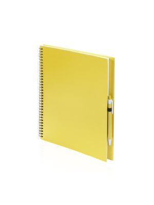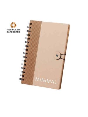 Libreta de anillas con tapas de suave tacto acabadas en resistente cartón reciclado y bolígrafo en cartón reciclado a juego. De atrevidos colores, 80 hojas lisas y con soporte para bolígrafo en contraportada.