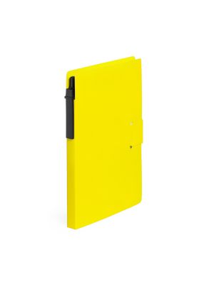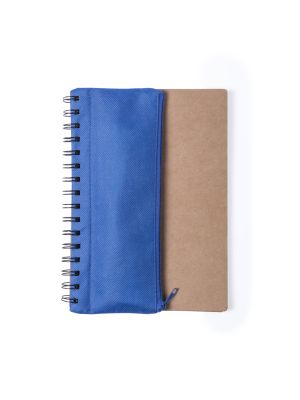 Libreta de anillas con tapas de suave tacto acabadas en resistente cartón reciclado. Con estuche en poliéster 600D de vivos colores y cierre de cremallera integrado en portada. Incluye bolígrafo en cartón reciclado y set de regla, lápices y sacapuntas en madera natural. 70 hojas lisas.