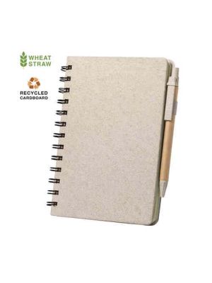 Set de libreta y bolígrafo de línea nature. Libreta de anillas con tapas rígidas en caña de trigo, para así fomentar la utilización de materias primas naturales y reducir las emisiones contaminantes y con soporte para el bolígrafo. De 80 hojas con diseño eco y disposición a una raya. Bolígrafo de mecanismo pulsador, con cuerpo en cartón reciclado y accesorios en caña de trigo, en tinta azul.