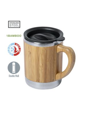 Taza YiraxTaza de línea nature y 420ml de capacidad. Con tapa en bambú y cuchara a juego en acero inox, con mango de madera. Presentada en atractiva caja de diseño eco.