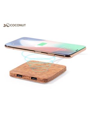 Cargador inalámbrico 10W de línea nature fabricado en coco. Tras el consumo de su fruto, del coco y su planta se pueden obtener multitud de productos, contribuyendo a la sostenibilidad del planeta y fomentando el uso de materias primas naturales. Incluye 2 salidas USB de 2100mA y es compatible con dispositivos equipados con tecnología de carga inalámbrica. Amplia superficie de marcaje y presentado en caja individual de diseño eco en cartón kraft.