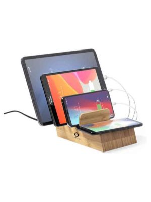 Estación de carga inalámbrica de línea nature, multidispositivo y de carga 10W, capaz de cargar simultáneamente hasta 4 dispositivos. Fabricada en bambú. Incluye 2 salidas USB y 1 salida Tipo C. compatible con dispositivos equipados con tecnología de carga inalámbrica. Cable de conexión de 150 cm con clavija europea, con amplia superficie de marcaje y presentado en atractiva caja de diseño eco. Disponible manual de instrucciones en español e inglés. En cumplimiento con los requisitos de seguridad: Sistema de protección contra sobrecalentamiento. Sistema de protección contra sobrecarga. Sistema de bloqueo para evitar cortocircuitos.