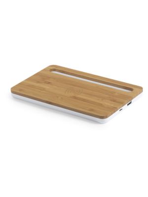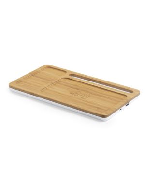 Cargador organizador inalámbrico de línea nature con función soporte para smartphone. Salida USB (cable incluido) de 1.000 mA. Permite cargar de manera simultánea hasta 2 dispositivos (1 mediante carga inalámbrica y 1 mediante cable). Hecho en bambú procedente de cortes naturales, con bandeja para objetos troquelada. Compatible con dispositivos equipados con tecnología de carga inalámbrica. Amplia superficie de marcaje y presentado en atractiva caja de diseño eco.