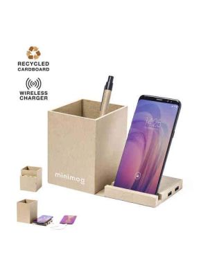Lapicero multifunción 4 en 1 de línea nature fabricado en cartón reciclado, contribuyendo a la conservación de los bosques y reduciendo considerablemente la huella de carbono. Con funciones lapicero, soporte para smartphone, cargador inalámbrico y puerto USB (2xUSB 2.0). Diseño plegable con ajuste magnético. Compatible con smartphones con tecnología de carga inalámbrica. Incluye cable micro USB en color blanco de 1 metro de largo. Presentado en atractiva caja de diseño eco, con manual de instrucciones en español e inglés.