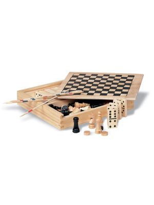 Set Juegos XigralSet de juegos en madera. Incluye mikado, ajedrez, damas y dominó. Presentado en estuche de madera con tapa-tablero. Tablero con lado liso para marcaje.Desde 2,45 € /ud